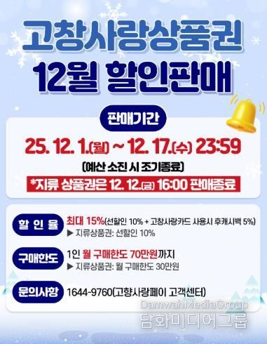 이번 12월 할인판매는 고창사랑카드는 12월17일 자정 전까지, 지류상품권의 경우 12월12일 오후 4시까지 구매할 수 있다.