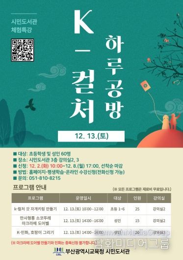 시민행정신문 기자 | 부산광역시립시민도서관(관장 이은경)은 오는 13일 시민도서관에서 초등학생과 성인 60명을 대상으로 일일 체험 특강 ‘K-컬처 하루공방’을 운영한다.