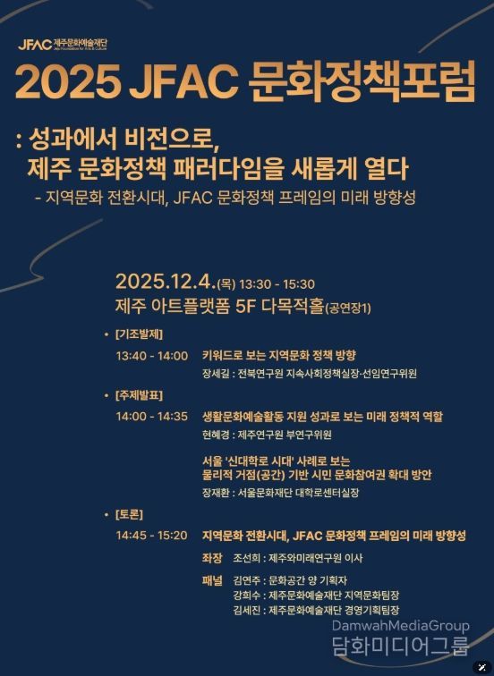 시민행정신문 기자 | 제주문화예술재단(이사장 김석윤)은 '다시 심는 성과, 피어나는 비전'이라는 슬로건으로 '2025년 재단 성과공유주간(이하 성과공유주간)'을 개최한다. 프로그램은 제주아트플랫폼(5층)에서 12월 4일부터 6일까지 3일간 진행된다.