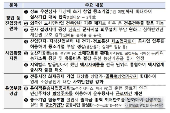 이번 방안은 경기 회복의 흐름이 민생현장의 지속가능한 성장과 도약으로 이어지도록, 중소기업과 소상공인이 사업운영 전반에서 체감하는 불합리한 규제애로를 선제적으로 개선하기 위해 마련됐다.