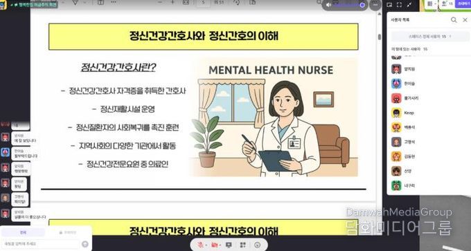 메타버스 플랫폼 ‘ZEP’을 활용한 비대면 과정은 총 14회 운영되며, 우울·불안 관리, 수면·식습관 개선, 스트레스 조절, 가족 소통기술 등 정신건강 증진 중심 교육을 체계적으로 제공했다.