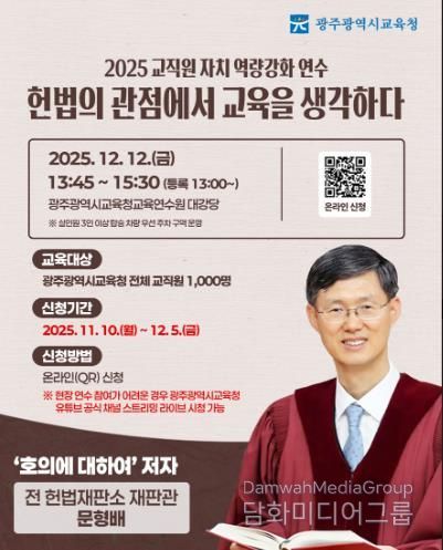 시민행정신문 기자 | 광주시교육청은 오는 12일 오후 1시45분부터 광주시교육청교육연수원 대강당에서 문형배 전 헌법재판관을 초빙해 ‘교직원 자치 역량 강화 연수’를 개최한다.