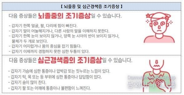 아울러, 뇌졸중과 심근경색증은 환자가 증상을 정확히 인지하고 표현할수록 골든타임 내 신속히 치료받는 것이 수월한 만큼, 환자의 생존율 제고 및 좋은 예후를 위해 질환의 조기 증상을 사전에 인지하는 것이 중요하다.