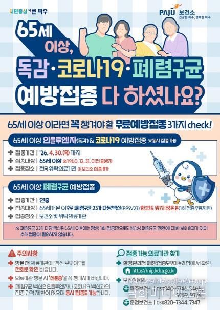 시민행정신문 기자 | 파주시는 겨울철 호흡기 감염병 확산에 대비해 65세 이상 어르신을 대상으로 독감(인플루엔자), 코로나19, 폐렴구균 예방접종 3종을 안내하며 접종 참여를 당부했다.