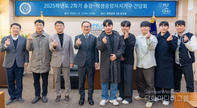 시민행정신문 강갑수 기자 | 경상국립대학교(GNU·총장 권진회)는 12월 3일 오전 10시 가좌캠퍼스 대학본부 3층 접견실에서 ‘2025학년도 2학기 총장-학생중앙자치기구 소통 간담회’를 개최했다. 이번 간담회는 총장의 학생 중심 대학경영 철학을 바탕으로 학생들의 의견을 직접 듣고 대학 정책에 반영하기 위해 1학기에 이어 마련됐다.