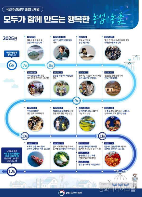 시민행정신문 이세훈 기자 | 농림축산식품부는 새 정부 출범 후 약 6개월동안 정책의 연속성과 과감한 혁신 기조 하에서 현장에서 체감할 수 있는 변화를 이끌어 내는 동시에, 만성적 쌀 공급 과잉, 농촌 고령화 등 농업·농촌의 구조적 문제 해결과 희망을 실현하는 농업·농촌을 만들기 위해 전력을 다하고 있다.
