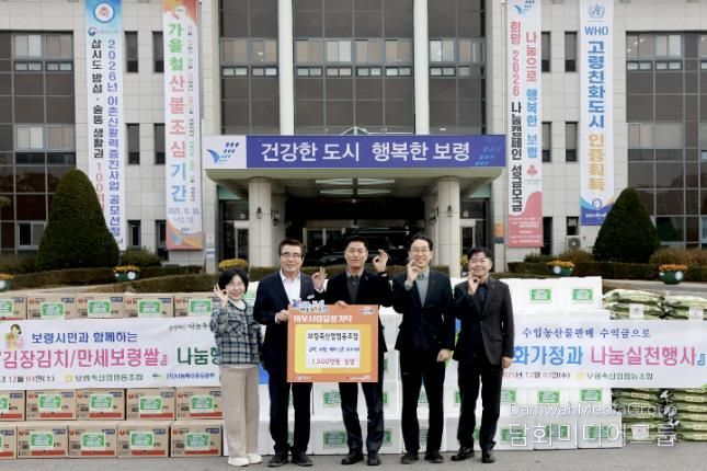 이날 보령시청 광장에서 진행된 기탁식에서 보령축산업협동조합은 사랑의 김치(2.5kg) 100박스, 라면 100박스, 백미(10kg) 100포 등 총 1,500만 원 상당의 물품을 전달했다.