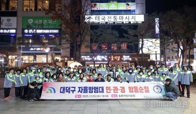 ![최충규 대덕구청장(사진 첫 번째 줄 왼쪽 여덟 번째)과 대덕구 자율방범대원 및 관계자들이 3일 송촌어린이공원에서 민·관·경 합동 야간 합동 순찰을 진행하기에 앞서 기념 촬영을 하고 있다.]](/data/photos/portnews/202512/20251204100301-74060.jpg)
