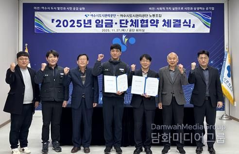 시민행정신문 강갑수 기자 | 여수시도시관리공단은 올해 9월 단체협약 체결에 이어, 지난 27일 공단 회의실에서 교섭대표 노동조합과 ‘2025년 임금협약’ 체결식을 개최했다.