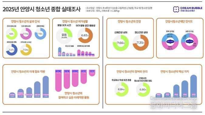 시민행정신문 강갑수 기자 | 안양시청소년재단은 5일 관내 초등학교 4학년부터 고등학교 3학년까지 재학 중인 청소년 2,782명과 학교 밖 청소년 53명을 대상으로 실시한 ‘2025년 안양시 청소년 종합 실태조사’ 결과를 발표했다.