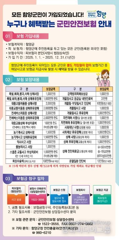 군민안전보험은 함양군에 주민등록을 둔 모든 군민이 별도의 가입 절차 없이 적용받는 것으로 개인이 가입한 민간 보험과 무관하게 중복 보상이 가능하며, 군민안전보험 콜센터를 통하여 접수·청구할 수 있다.