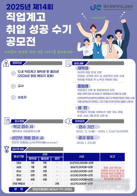 시민행정신문 기자 | 제주특별자치도교육청은 고졸 취업 성공 문화를 확산하고 직업계고에 대한 긍정적 인식을 높이기 위해‘제14회 직업계고 취업 성공 수기 공모전’을 8일부터 내년 1월 2일까지 개최한다.