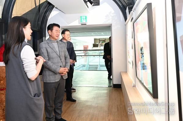 이날 김동근 시장은 본관 1층 로비에서 담은캘리그라피의 ‘영화 속 명대사(한글의 아름다움)’ 전시를 감상한 뒤, 연결통로로 이동해 ‘같이 걷는 발걸음’의 최소라 작가를 격려하고, 전시 공간 운영 방향에 대한 의견을 청취했다.