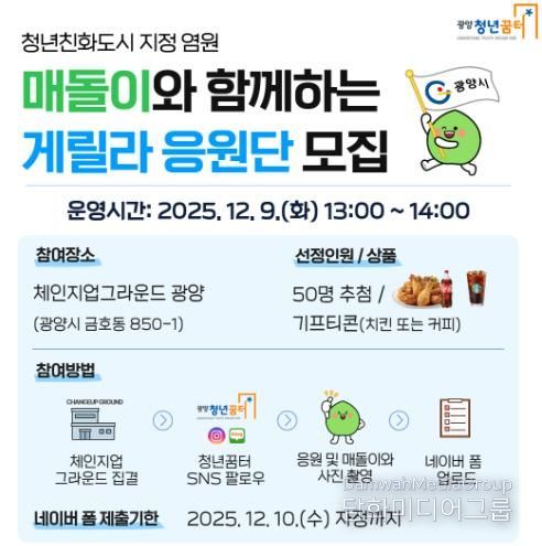 시민행정신문 강갑수 기자 | 광양시는 청년친화도시 지정에 대한 시민 공감대를 확산하고 청년 참여 분위기를 조성하기 위해 오는 12월 9일 오후 1시부터 2시까지 체인지업그라운드 광양 일대에서 ‘매돌이와 함께하는 청년친화도시 지정 염원 게릴라 응원단’을 운영한다고 5일 밝혔다.