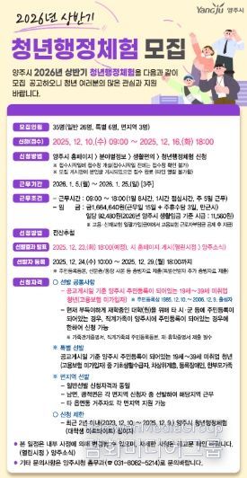 근무 기간은 2026년 1월 5일부터 1월 25일까지 총 3주간이며, 양주시 본청, 행정복지센터, 도서관 등에서 근무하게 된다.