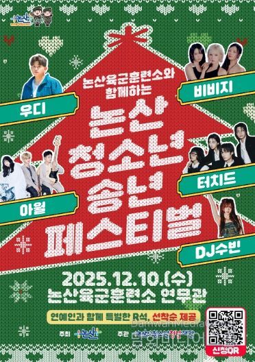 ‘청소년 송년페스티벌’은 지역 청소년들이 친구와 가족, 동료와 함께 한 해를 돌아보고 다음 해의 출발을 다짐하는 자리로, 논산시를 대표하는 연말 청소년 축제다. 올해 행사는 국방친화도시의 정체성을 살려 다시 육군훈련소 연무관에서 열리며, 관내 청소년과 군 장병·가족, 일반 시민 등이 함께 참여하는 열린 축제로 진행된다.