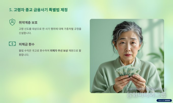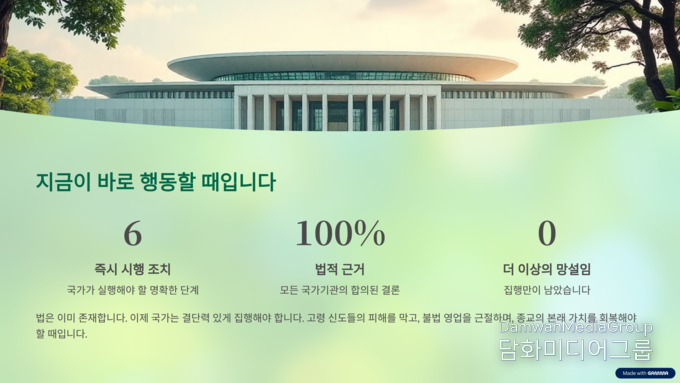천도재·49재·염불·기도 등은 종교행위로 비과세, 반면 위패 제작·판매·유골 가공·보석화·봉안 등은 영업행위로 과세라는 기준을 명확히 법으로 분리하고, 분리 회계 및 영업신고 의무를 도입해야 한다. 또한 65세 이상 고령자를 대상으로 이뤄지는 종교금융 사기는 형량을 가중, 탈세·무허가 봉안·기망이 결합된 종합 사기는 중형 선고까지 가능하도록 특별법을 제정해야 하며, 피해금은 국고 환수 후 피해자 우선 배상 원칙을 확립해야 한다. 이것이야말로 불법 포교당 문제의 영구적 종결을 위한 국가개입의 완성이다.