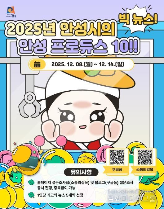 시 관계자는 “2025년 안성이 이뤄낸 의미 있는 변화들은 시민 여러분의 관심과 성원이 있었기에 가능했다”며 “한 해를 마무리하는 시점에 시민분들이 생각하는 ‘올해 안성의 대표 뉴스’ 선정에 많은 참여를 부탁드린다”고 밝혔다.