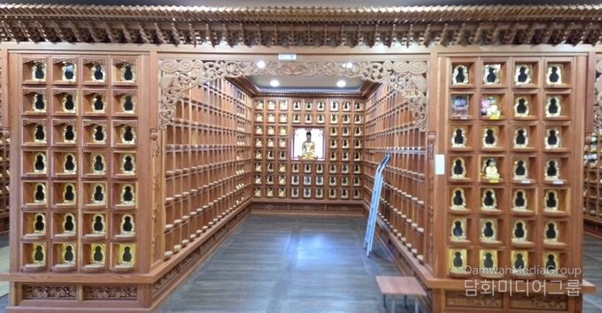 정심원은 이러한 도량의 정신을 가장 충실히 반영한 층으로, 슬픔·애도·그리움이라는 감정이 번뇌의 물결에서 멈추고 고요靜心의 지혜로 전환되는 수행의 공간으로 디자인되었다. 은은한 황금빛 조명은 부처님의 지혜광명을 상징하고, 벽면과 여백의 구성은 불교 미학의 핵심인 적요寂寥, 삼매三昧의 기운을 담아 참선과 기도의 흐름을 자연스럽게 이끌어 준다.