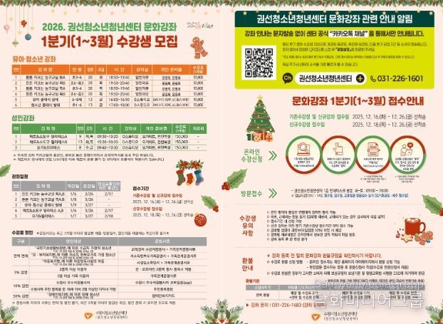 시민행정신문 기자 | 수원시청소년청년재단 권선청소년청년센터는 오는 1월 6일부터 3월 27일까지 지역사회 평생학습 문화강좌 1분기(1~3월) 수강생을 모집한다.