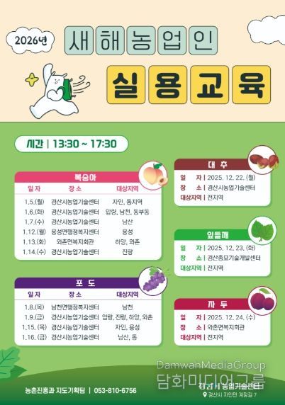 시민행정신문 강갑수 기자 | 경산시는 12월 22일부터 내년 1월 16일까지 총 13회에 걸쳐『2026년도 새해농업인실용교육』을 실시한다.