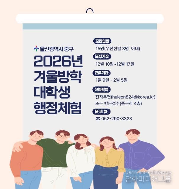 시민행정신문 강갑수 기자 | 울산 중구가 12월 10일부터 12월 17일까지 ‘2026년 겨울방학 대학생 행정체험’ 참여자 15명을 모집한다.