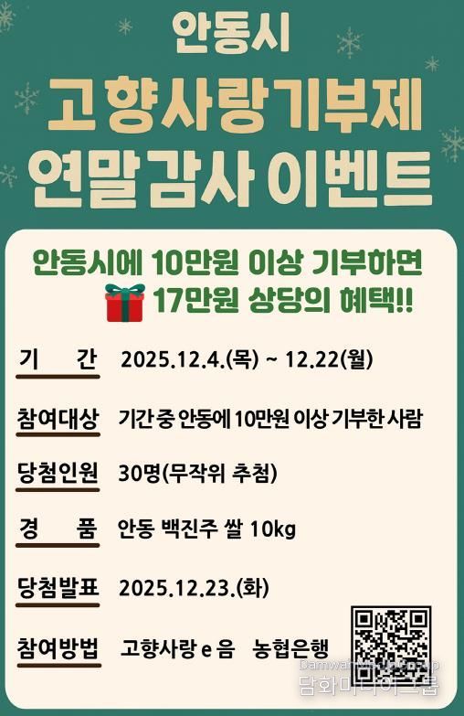 시민행정신문 강갑수 기자 | 안동시는 연말정산 시즌을 맞아, 고향사랑기부제 참여자에게 감사의 뜻을 전하고 기부 문화를 확산하기 위해 12월 22일(월)까지 ‘안동시 고향사랑기부제 연말 감사 이벤트’를 진행한다고 밝혔다.