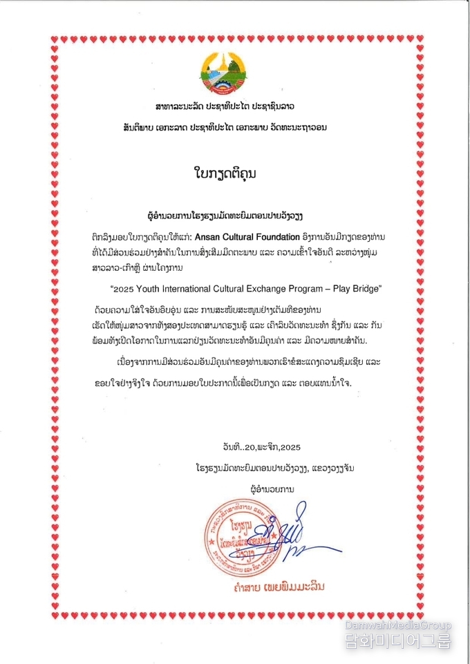 아울러 재단은 사전 현지 교육환경 조사에 기반해 쇼케이스 무대와 음향을 준비하고, 맞춤형 교육연극 워크숍 기획과 전문 통역가 배치 등 세심한 준비를 통해 프로그램의 완성도를 높였다. 이에 방비엥 고등학교장은 “라오스 청소년들에게 새로운 문화예술교육을 경험하게 해준 안산시와 안산문화재단에 감사드리며, 두 도시의 교류 활동이 지속되기를 기대한다”고 전하며 감사장을 전달했다.