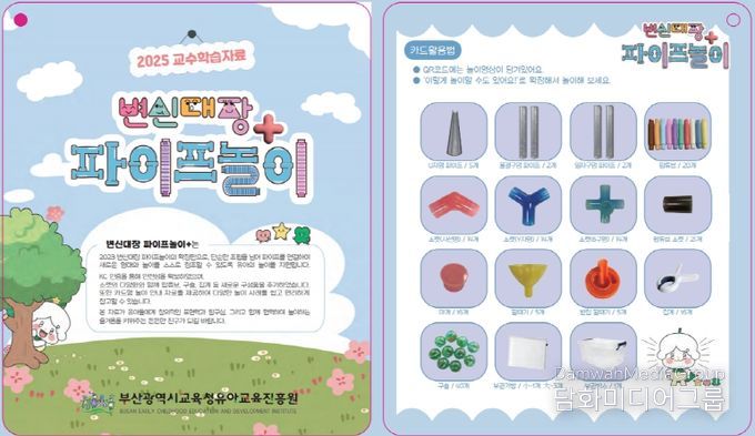 올해는 유치원 현장의 의견을 반영한 ‘2025 변신대장 파이프놀이+’ 자료를 개발해 부산 지역 공·사립 유치원과 유아학급이 설치된 특수학교에 보급했다. 이번 자료는 사선형·Y자형·6구형 소켓 등 연결 요소를 다양화하고, 팝튜브 등 추가 구성품을 확장해 기존 ‘2023 변신대장 파이프놀이’의 활용 범위를 넓힌 확장판이다.