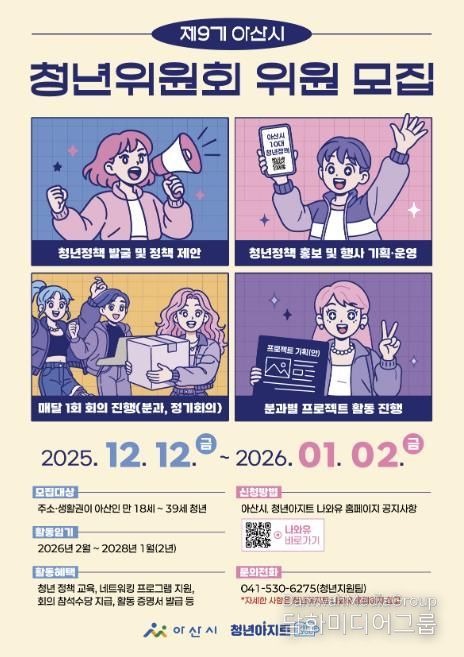 시민행정신문 강갑수 기자 | 아산시는 청년의 시정 참여를 확대하고 지역 청년활동 기반을 강화하기 위해 ‘제9기 아산시 청년위원회’에 참여할 청년 위원을 2026년 1월 2일까지 공개 모집한다.