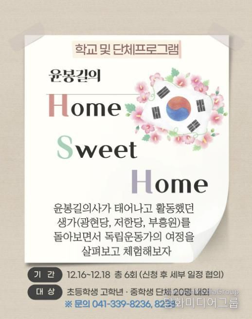 시민행정신문 강갑수 기자 | 예산군 윤봉길의사기념관은 충남지역 학생들을 대상으로 학교 연계 교육프로그램 ‘윤봉길의 홈 스위트 홈(Home Sweet Home)’을 12월 16일부터 18일까지 시범운영하고 있다.