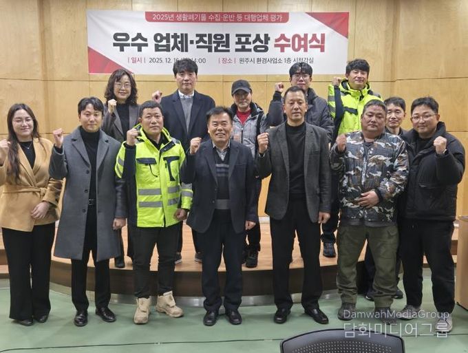 시민행정신문 강갑수 기자 | 원주시는 12월 16일 '2025년 생활폐기물 수집ㆍ운반 대행업체 평가결과'에 따른 우수등급 업체 및 소속 직원을 대상으로 원주시장 상장 및 표창장을 수여한다.