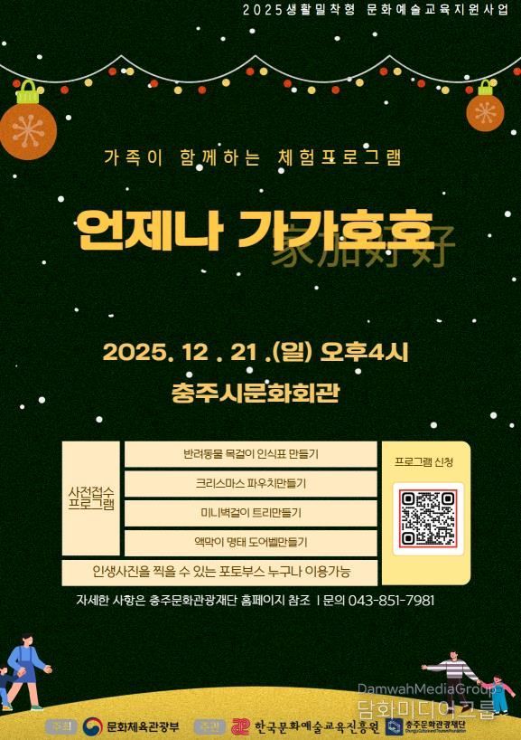 시민행정신문 강갑수 기자 | 충주문화관광재단이 가족대상 연말 문화예술 교육프로그램 ‘언제나 가가호호(家加好好)’를 오는 12월 21일 오후 4시부터 충주시문화회관에서 개최한다.