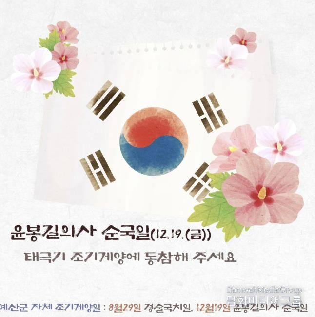 시민행정신문 강갑수 기자 | 예산군은 매헌 윤봉길 의사 순국 제93주기를 맞아 오는 12월 19일 조기(弔旗) 달기 운동을 추진한다고 밝혔다.
