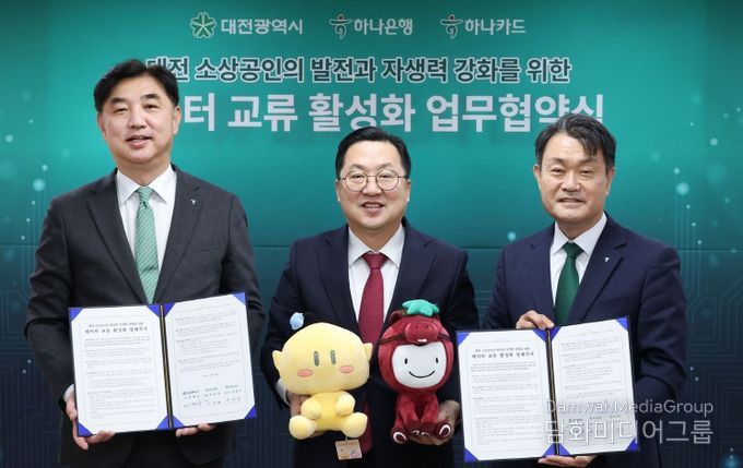 시민행정신문 강갑수 기자 | 대전시는 16일 하나은행과 하나카드와 함께 지역 소상공인의 지속 가능한 성장 기반을 마련하기 위한 ‘데이터 교류 활성화 업무협약’을 체결했다.