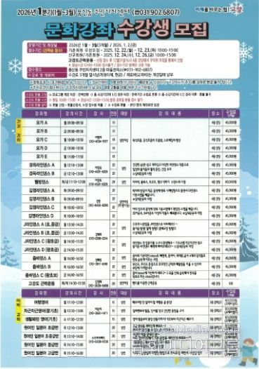 시민행정신문 강갑수 기자 | 고양특례시 일산동구 풍산동 주민자치회가 오는 22일부터 2026년 1분기 주민자치센터 문화강좌 수강생을 모집한다고 밝혔다.