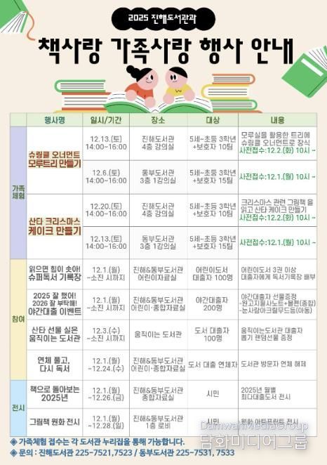 시민행정신문 강갑수 기자 | 창원특례시 진해도서관과는 연말을 맞아 가족과 함께 즐길 수 있는 따뜻하고 풍성한 ‘2025 책사랑 가족사랑 행사’를 진해도서관 및 동부도서관에서 12월 한 달간 운영한다.