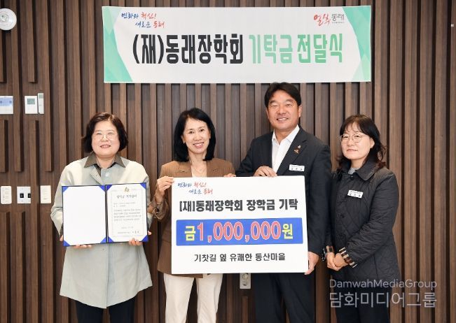 시민행정신문 강갑수 기자 | 부산 동래구는 지난 11월 수민동 기찻길 옆 유쾌한 동산마을이 올해도 (재)동래장학회에 장학기금 100만 원을 기탁했다고 밝혔다.