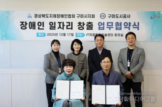 시민행정신문 강갑수 기자 | 구미도시공사는 지난 12월 17일, (사)경북지체장애인협회 구미시지회와 장애인 일자리 창출을 위한 업무협약을 체결했다. 이번 협약은 공공기관과 장애인 단체 간 협력체계를 구축해 장애인의 안정적인 고용기회를 확대하고, 지역사회 내 지속 가능한 일자리 모델을 발굴하기 위해 마련됐다.