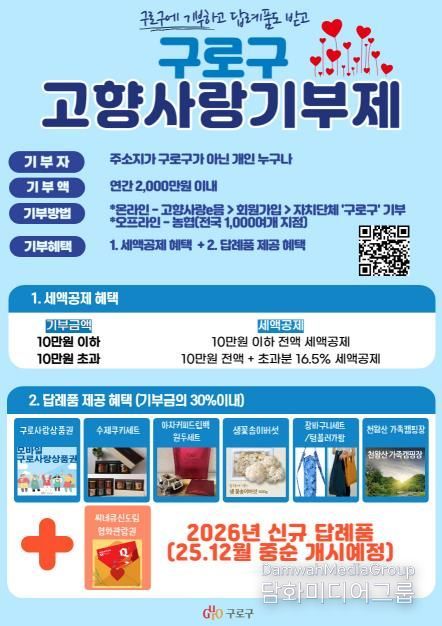 장인홍 구로구청장은 “고향사랑기부제는 기부자에게 세액공제와 답례품이라는 풍성한 혜택까지 함께 누릴 수 있는 제도”라며 “지역 경제에 활력을 불어넣고 우리 이웃들에게 따뜻한 희망이 될 수 있도록 많은 관심과 참여를 바란다”고 말했다.