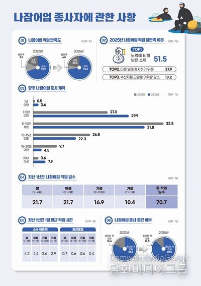 직업 만족도의 경우 응답자의 73.6%가 나잠어업에 만족한다고 응답해 전 주기 대비 2.7%p 증가했다. 불만족 사유로는 ‘노력에 비해 소득이 낮아서’(51.5%), ‘다른 일에 종사하기 위해’(27.9%) 순으로 나타났다.