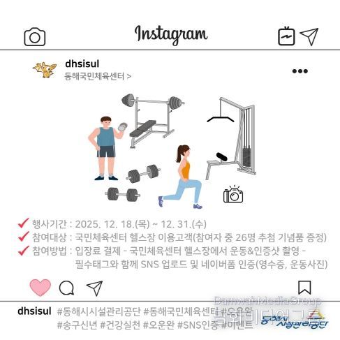 시민행정신문 강갑수 기자 | 동해시시설관리공단(이사장 이용빈)은 연말연시를 맞아 시민들의 건강관리 장려하고 헬스장 이용 활성화를 위해 '송구신년 건강실천 오운완 SNS 인증 이벤트'를 개최한다고 밝혔다.