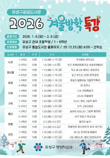 시민행정신문 기자 | 대전 유성구는 내년 1월 6일부터 2월 6일까지 관내 8개 공공도서관에서 초등학생 대상으로 ‘겨울방학 특강’을 운영한다.