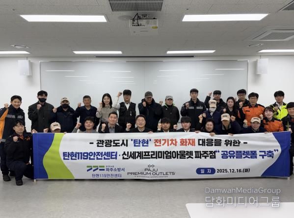 시민행정신문 강갑수 기자 | 파주소방서 탄현119안전센터는 16일 신세계사이먼 파주 프리미엄아울렛과 함께 탄현면 관광단지 내 전기차 화재에 신속 대응하기 위한 화재진압 장비 ‘공유플랫폼’을 구축했다.
