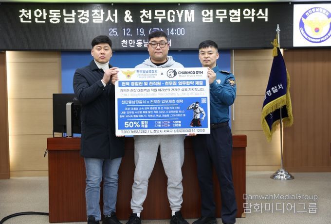 시민행정신문 이존영 기자 | 천안 동남경찰서(서장 송해영)는 2025년 12월 19일(금) 오후 2시, 천안동남경찰서 중회의실에서 무에타이·MMA 전문 체육관인 ‘천무짐’(관장 문보람)과 ‘경찰관 체력 증진 및 복지 향상’을 위한 업무협약(MOU)을 체결했다고 밝혔다.