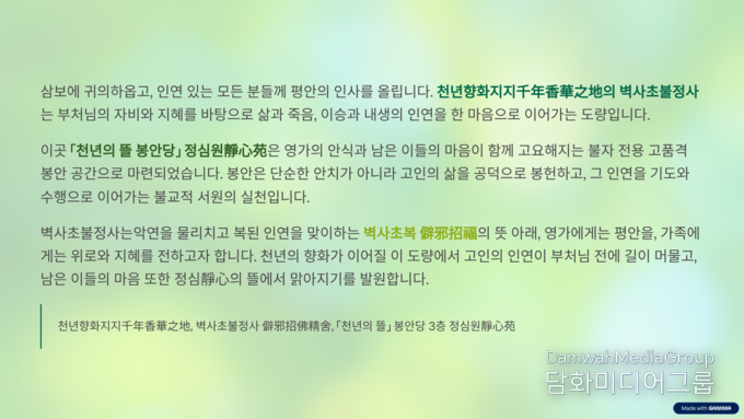 봉안에서 기제사까지, 추모에서 다음 생의 서원까지, 천년향화지지의 벽사초불정사와 천년의뜰 봉안당은 오늘날 한국 불교 봉안문화가 나아갈 하나의 완성형 모델로 평가받고 있다.
