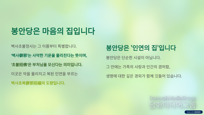 담화총사는 초대 법왕 일붕 서경보 큰스님 비서실장으로 8년 반 동안 수행의 시간을 보낸 인물이다. 그 시간은 행정과 의전의 경험을 넘어, 스승의 삶과 가르침을 곁에서 체득한 수행의 기록이었다. 벽사초불정사의 운영 철학과 공간 구성 곳곳에는 그 수행의 흔적이 고스란히 녹아 있다.