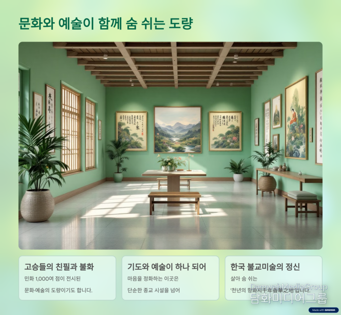 특히 사찰을 감싸는 천년의 숲길은 걷기 명상과 치유의 동선으로 설계되어, 고인을 추모하는 이들의 마음을 자연스럽게 고요로 이끈다. 숲길을 따라 이어지는 공간에는 세계 각지의 관광 사진, 정문부 장군의 북관대첩비 관련 기록, 그리고 유엔에 보관됐던 6·25 전쟁 사진 등 역사적·세계사적 콘텐츠도 함께 전시돼 있다. 개인의 추모가 민족과 인류의 기억으로 확장되는 지점이다.