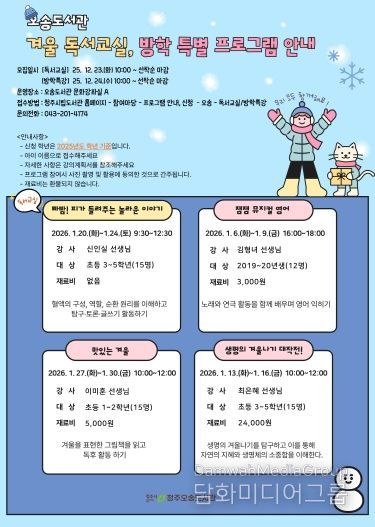시민행정신문 강갑수 기자 | 청주오송도서관 권역 내 7개관(오송·서원·흥덕·신율봉·강내·옥산·가로수)은 겨울방학을 맞아 독서교실 및 방학 특별프로그램 수강생을 모집한다.