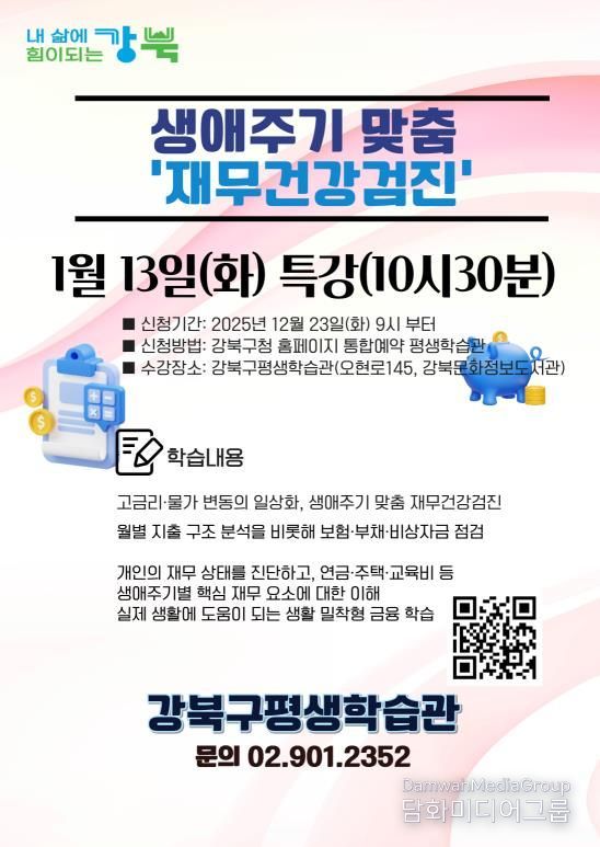 이번에 운영되는 ‘생애주기 맞춤 재무건강검진’ 과정은 1월 13일(화) 오전 10시 30분부터 12시까지 강북구 평생학습관에서 진행될 예정이다. 월별 지출 구조 분석을 비롯해 보험·부채·비상자금 점검을 통해 개인의 재무 상태를 진단하고, 연금·주택·교육비 등 생애주기별 핵심 재무 요소에 대한 이해를 돕는 내용으로 구성됐다.